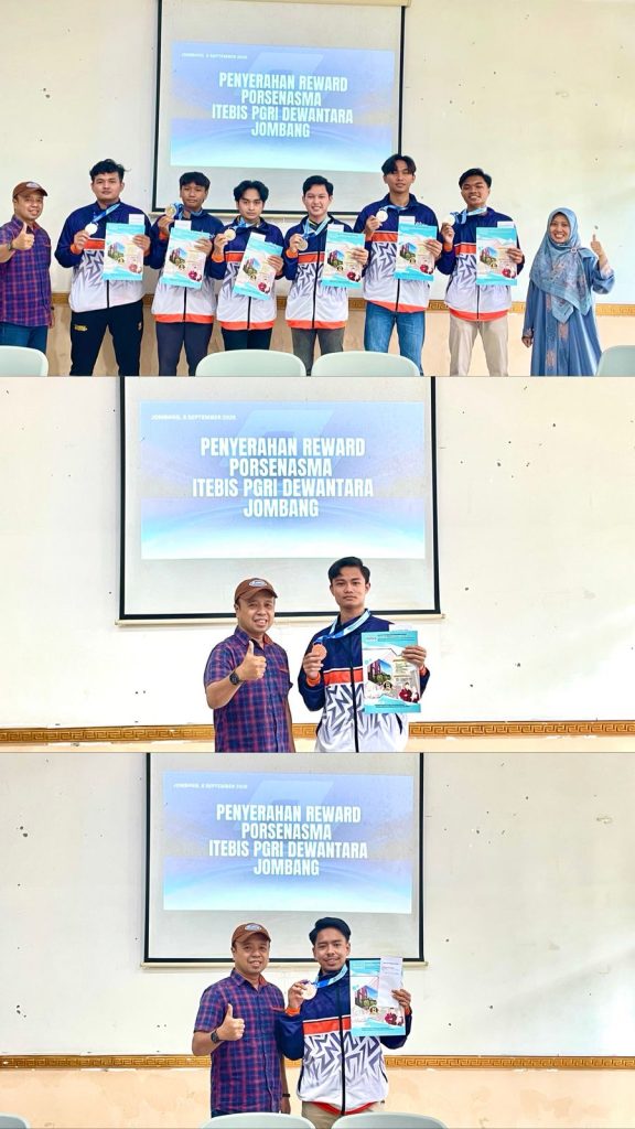 Pada hari Sabtu, 6 September 2025, ITEBIS PGRI Dewantara Jombang mengadakan acara Penyerahan Reward PORSENASMA sebagai bentuk apresiasi kepada mahasiswa yang berprestasi dalam berbagai cabang, termasuk e-sport, karate, tenis meja, nyanyi keroncong, proposal PKM, dan nyanyi dangdut. Penghargaan ini diberikan atas kerja keras, dedikasi, dan semangat juang yang telah mereka tunjukkan dalam ajang yang diselenggarakan di Madiun pada 4 hingga 9 Agustus 2025. Pemberian reward ini diharapkan dapat memotivasi seluruh mahasiswa untuk terus berkarya, berprestasi, dan mengharumkan nama baik institusi.