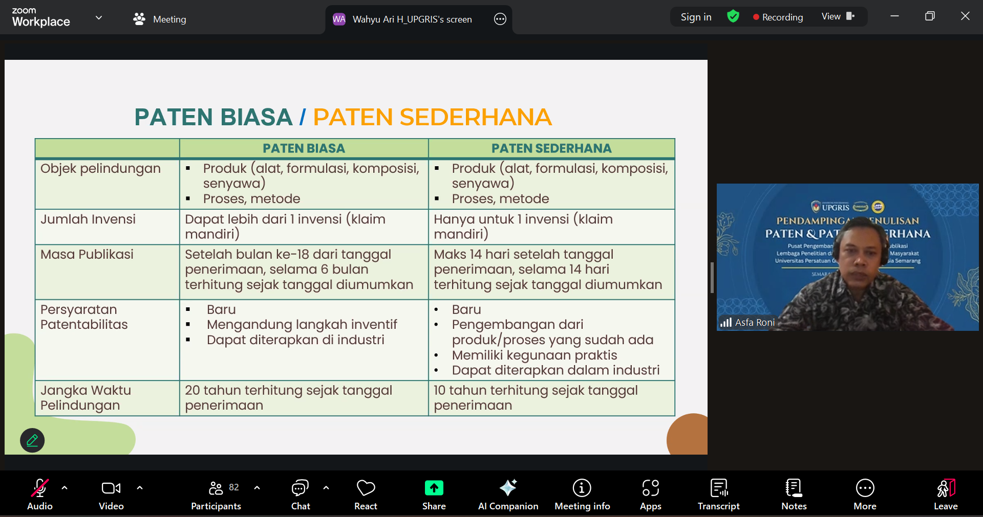 Pusat Pengembangan HKI, Jurnal, dan Publikasi LPPM Universitas PGRI Semarang menyelenggarakan kegiatan Pendampingan Penulisan Paten dan Paten Sederhana pada Kamis, 25 September 2025. Acara ini digelar secara daring melalui Zoom Meeting dengan menghadirkan Asfaroni, S.T., M.H., Pemeriksa Paten Madya, sebagai narasumber utama.