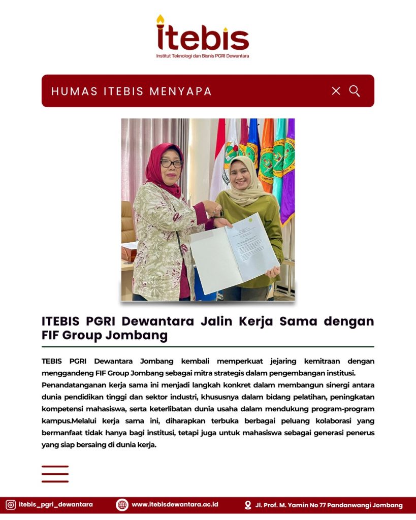 Humas & Kerjasama ITEBIS PGRI Dewantara merupakan unit strategis yang berperan dalam membangun citra positif institusi, memperluas jaringan kemitraan, serta mengelola komunikasi internal dan eksternal kampus. Seiring transformasi dari STIE menjadi Institut Teknologi dan Bisnis (ITEBIS) PGRI Dewantara Jombang, peran kehumasan semakin diperkuat dengan pendekatan profesional, adaptif, dan kolaboratif.